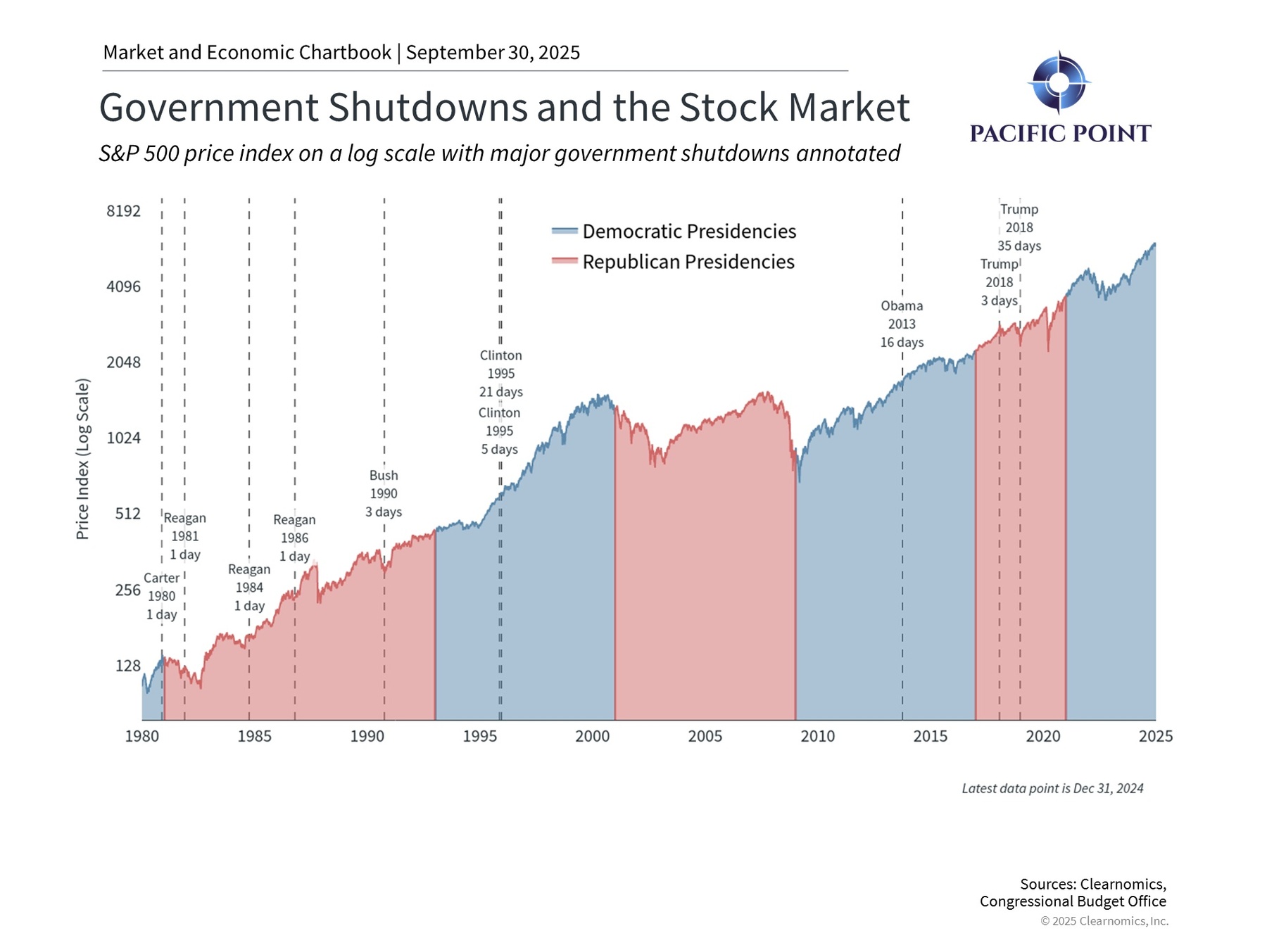 The chart demonstrates that funding lapses have been recurring events since 1980 across administrations from both parties, yet they’ve produced minimal lasting market consequences. This pattern held even during particularly contentious episodes, including those under Reagan, Clinton’s 21-day lapse in 1995, Obama’s 16-day disruption in 2013, and Trump’s record 35-day shutdown spanning late 2018 to early 2019. From an investment perspective, these events have functioned as brief interruptions rather than serious economic threats.